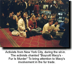 On Sunday, December 19, the Animal Defense League of New York City held a successful sit-in at Macy's Herald Square on 34th street. Activists from all over the east coast drew attention to Macy's role in the fur trade taking new steps in the non-violent fight to save the innocent lives of millions. The sit-in lasted for nearly two hours. About thirty activists took part and twenty-three were arrested when they were asked to leave by law enforcement and refused to move. Of those arrested in the store, all were charged with trespassing, and fifteen who refused to move when arrested and were dragged out of the store by police were given an additional charge of resisting arrest and were released from jail the next day.