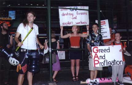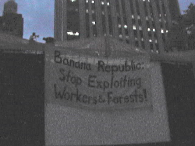 Two non-violent protesters were arrested June 26 after hanging a banner in protest of sweatshop labor and forest destruction. Citing worker mistreatment in garment factories and destructive logging of redwood forests, the activists draped a 350 square foot banner over the screen of the Bryant Park Film Series being sponsored by Banana Republic which read "Banana Republic: Stop Exploiting Workers and Forests!" The banner unfurled in front of thousands of spectators who awaited the evening's film.