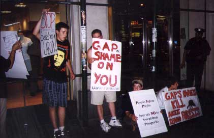 Protestors also object to Gap Inc.'s use of sweatshops in Saipan, a U.S. territory where the company escapes trade tariff laws for imports by producing within the legal boundaries of the U.S, but ignores US minimum wage and labor laws. The Fisher family, who owns Gap Inc., is also the major owner of Mendocin endangered and fragile redwood forests in Mendocino County, California. Their logging is destroying habitat for endangered species and other wildlife in some of the world's remaining redwood forests.