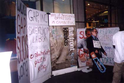 The banner hang took place during a week of action called by the human rights organization Global Exchange in response to a massive workers' strike in Cambodia, which ended unsuccessfully earlier this month. Activists believe that negotiations between these garment workers and their employers could continue if consumers continue to pressure those that buy from the factories-- many of which are U.S. corporations like Gap, Inc.